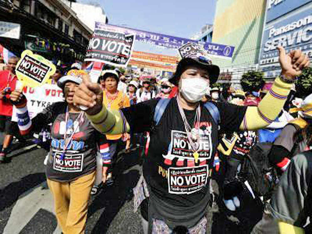 Hauptverantwortlich mit einer nie da gewesenen Hetze und Aufwieglung war der Gelbhemden-Anführer SUTHEP. Er vertrat die Eliten und rief auf zu einem Wahlboykott. Alternative: Die "ungebildete Landbevölkerung" hat nur eine Stimme, die Bangkok-Eliten und Gruppen aus der südlichen Heimat Sutheps (Ko Samui, Phuket und Umgebungen) haben drei Stimmen.